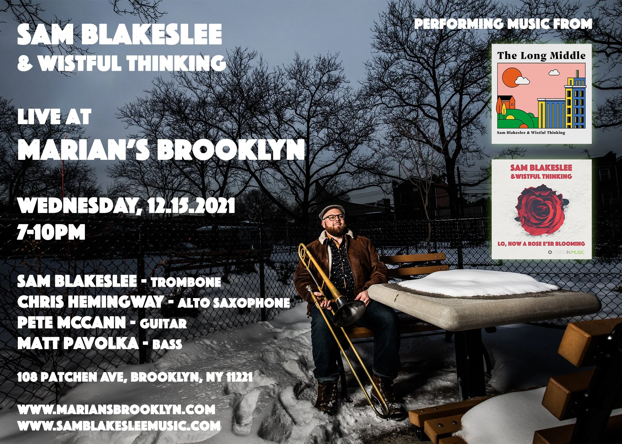 To celebrate the release of the new holiday single “Lo, How A Rose,” I’m looking forward to performing at Marian’s Brooklyn on Wednesday 12/15 with an exciting NYC incarnation of Wistful Thinking that features the talents of Chris Hemingway (alto saxophone), Pete McCann (guitar), and Matt Pavolka (bass). See the poster below for more info: